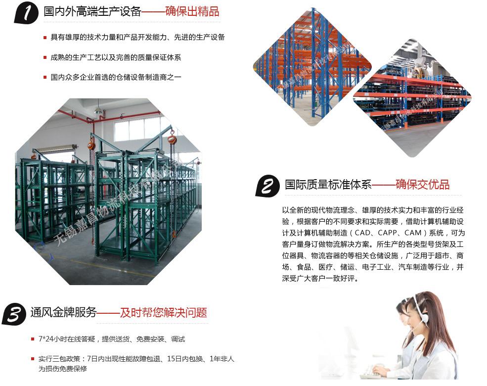 無錫嘉昌倉儲貨架有限公司主要產品有:鉚釘貨架、角鋼貨架、中型貨架、重型貨架、懸臂式貨架、流利式貨架、重力式貨架、壓入式貨架、模具架、閣樓貨架、鋼平臺、密集架、線棒架、自動化立體倉庫貨架以及周邊配套設施(托盤、周轉箱、倉儲籠、堆垛架、物流臺車、零件盒、工具車、工具柜、工作桌、文件柜、更衣柜、小推車、輥道輸送線、網片隔斷、液壓升降平臺以及液壓搬運車等)。